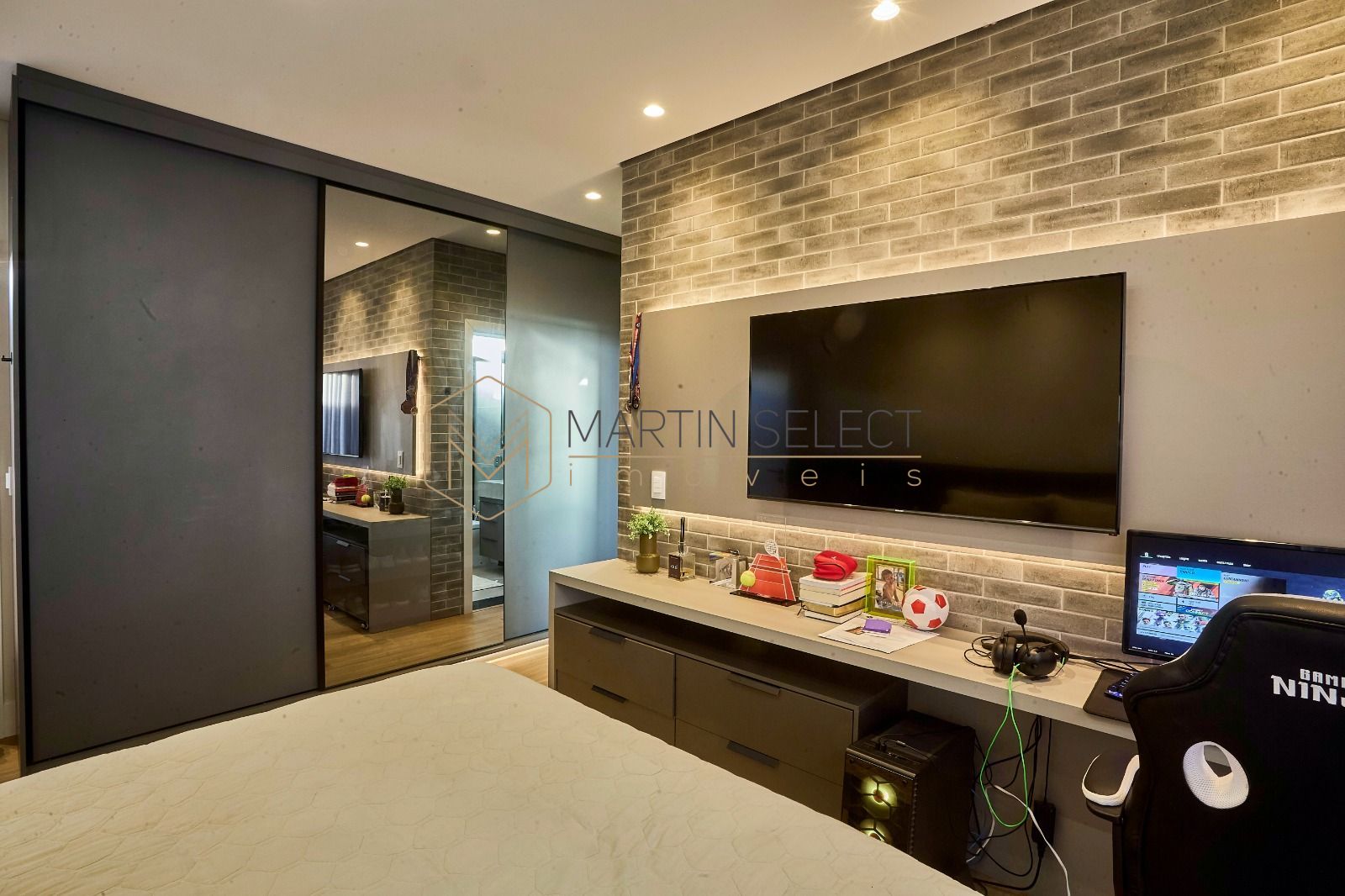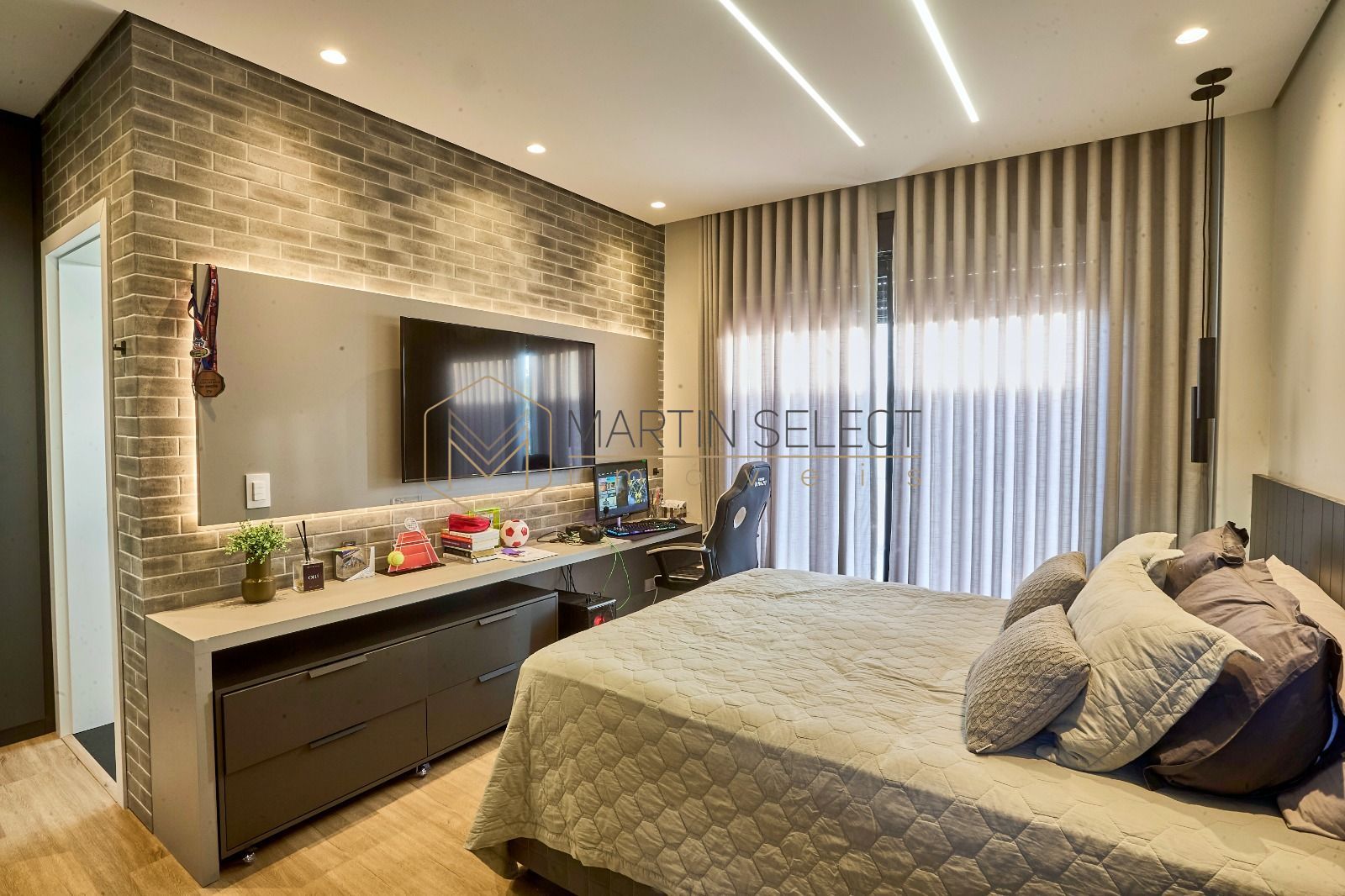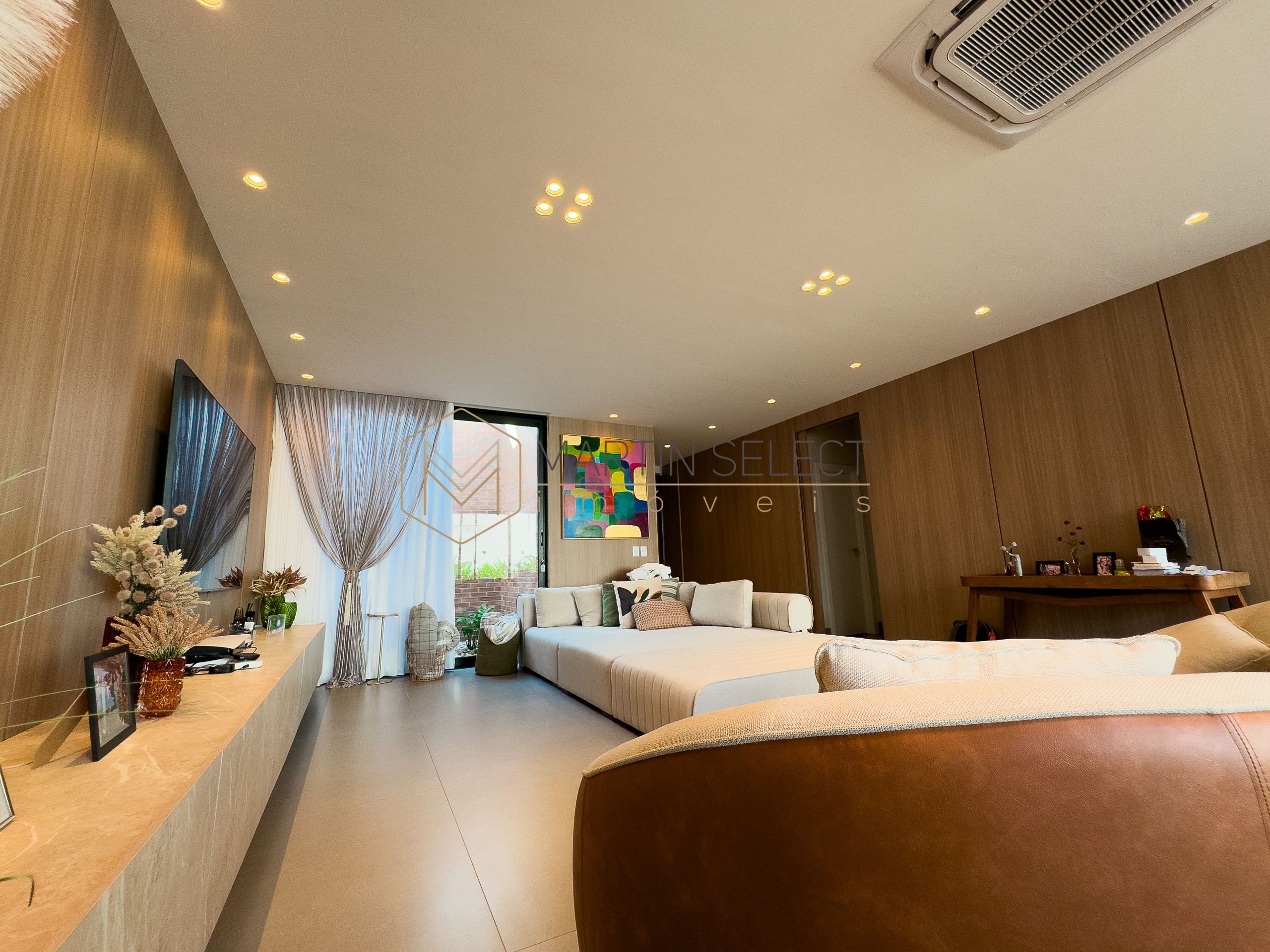 Esse imponente imóvel, foi pensado para famílias com até 3 filhos viverem com muito conforto em 4 lindas suítes no piso superior, além de uma suíte multiuso no térreo, hoje utilizada como escritório.